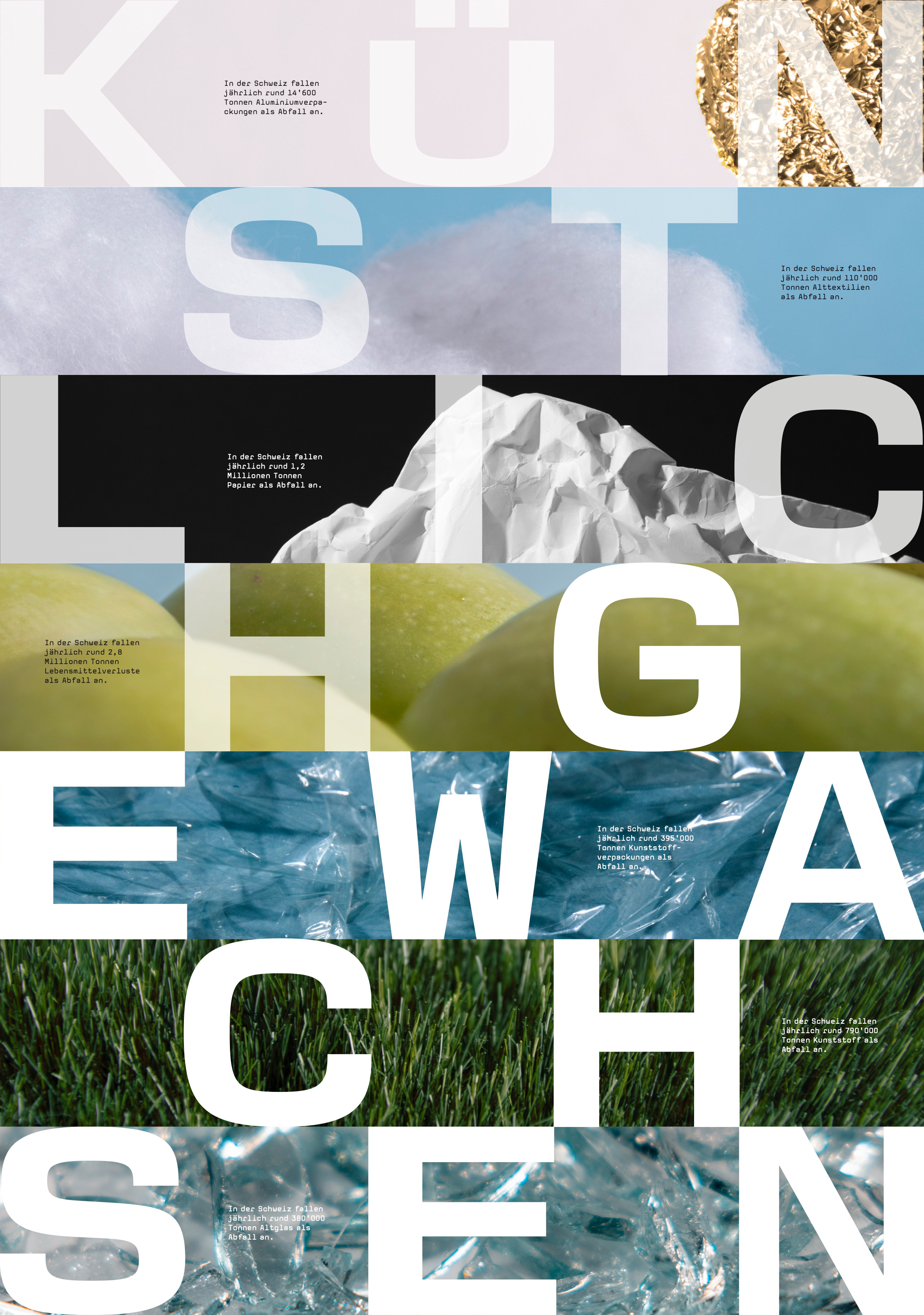 What does nature look like when it is no longer real? Aluminium replaces the sun, textile becomes clouds, paper becomes a mountain, foodstuffs become hills, plastic becomes water and meadow, glass becomes ice. From waste emerge landscapes, artificially grown yet deceptively real. The photographic staging shows nature where there is none and blurs the boundary between beauty and destruction. The poster is constructed like an ideal world, clearly divided into columns that separate the various artificial natural worlds from one another.