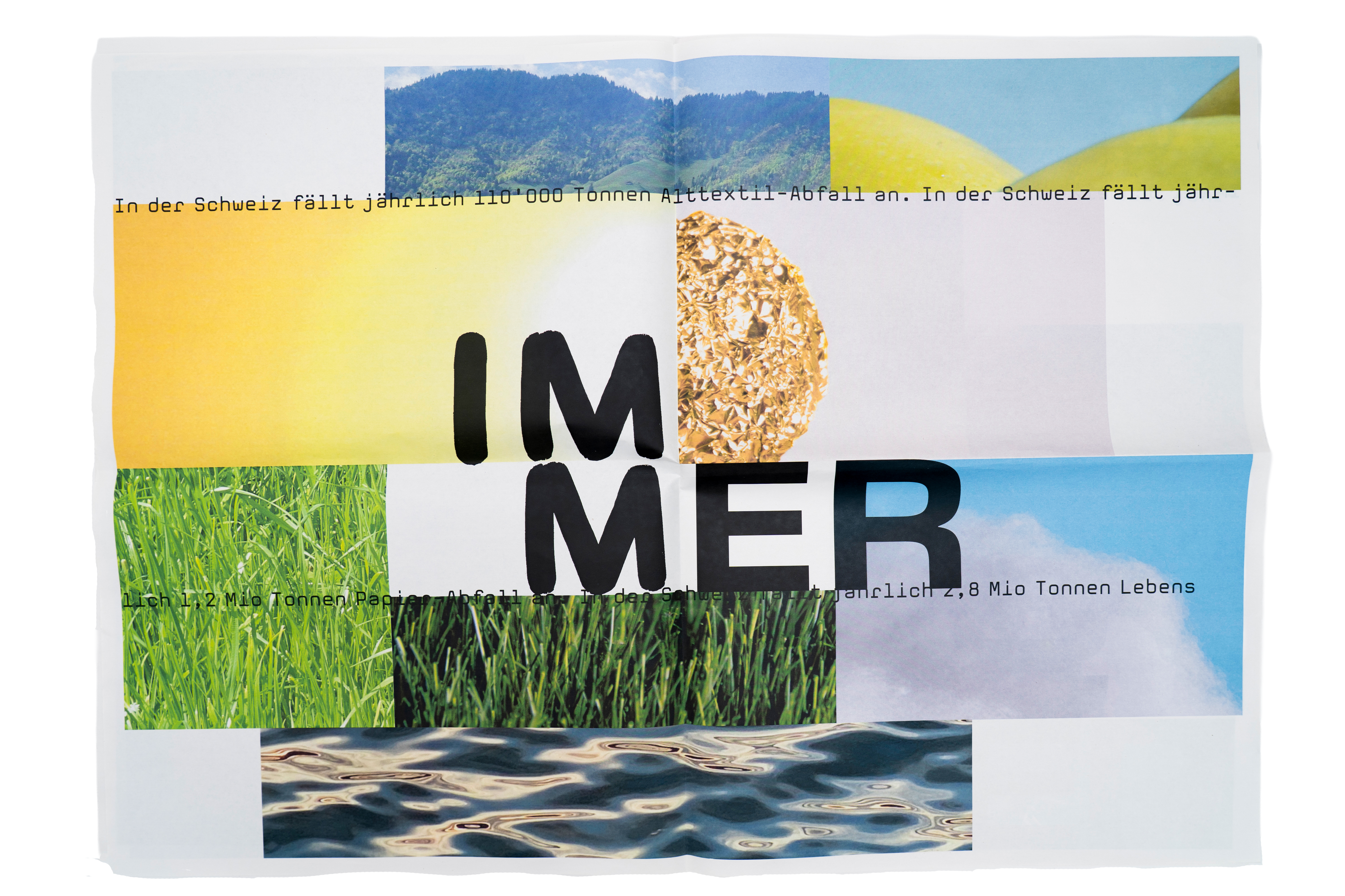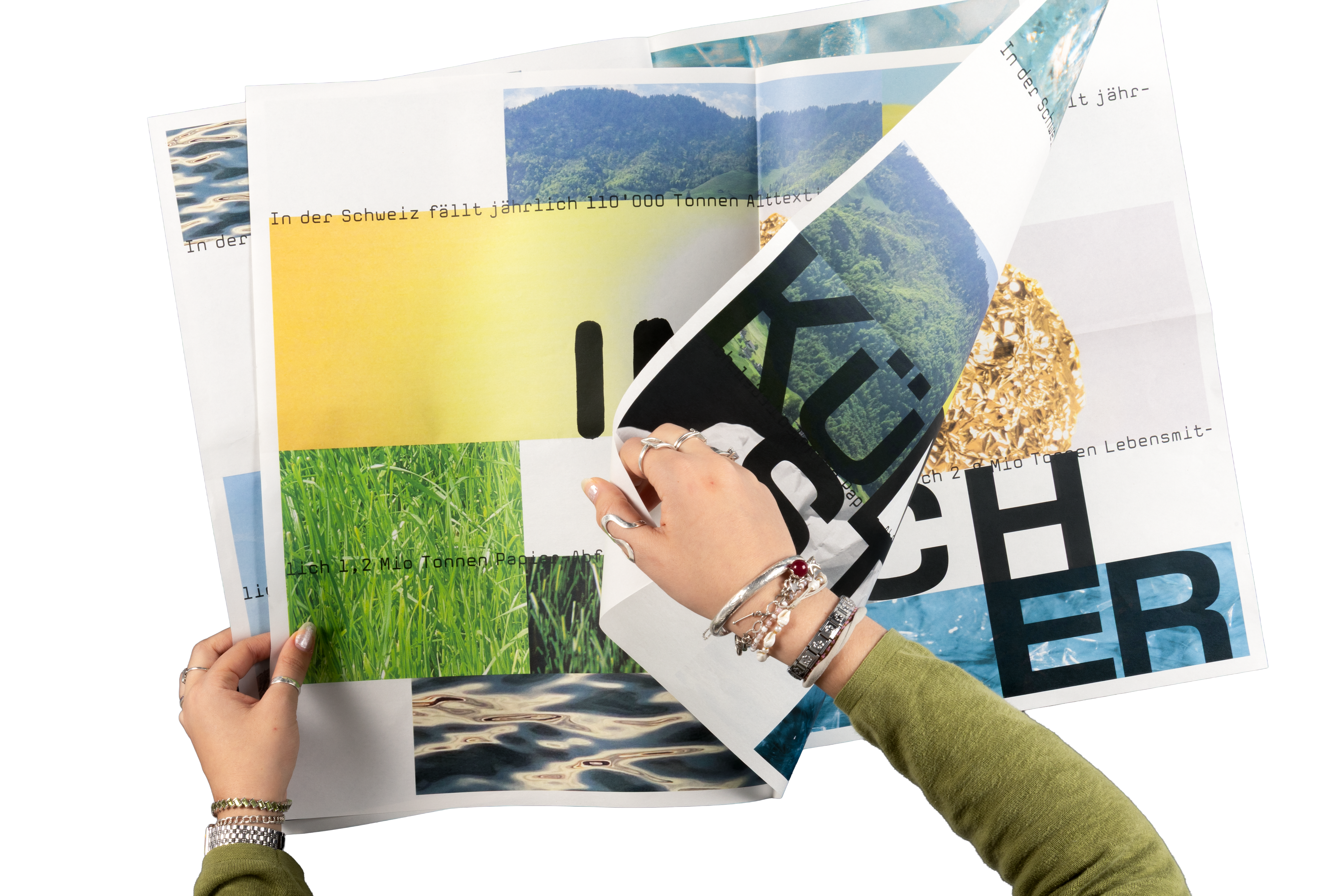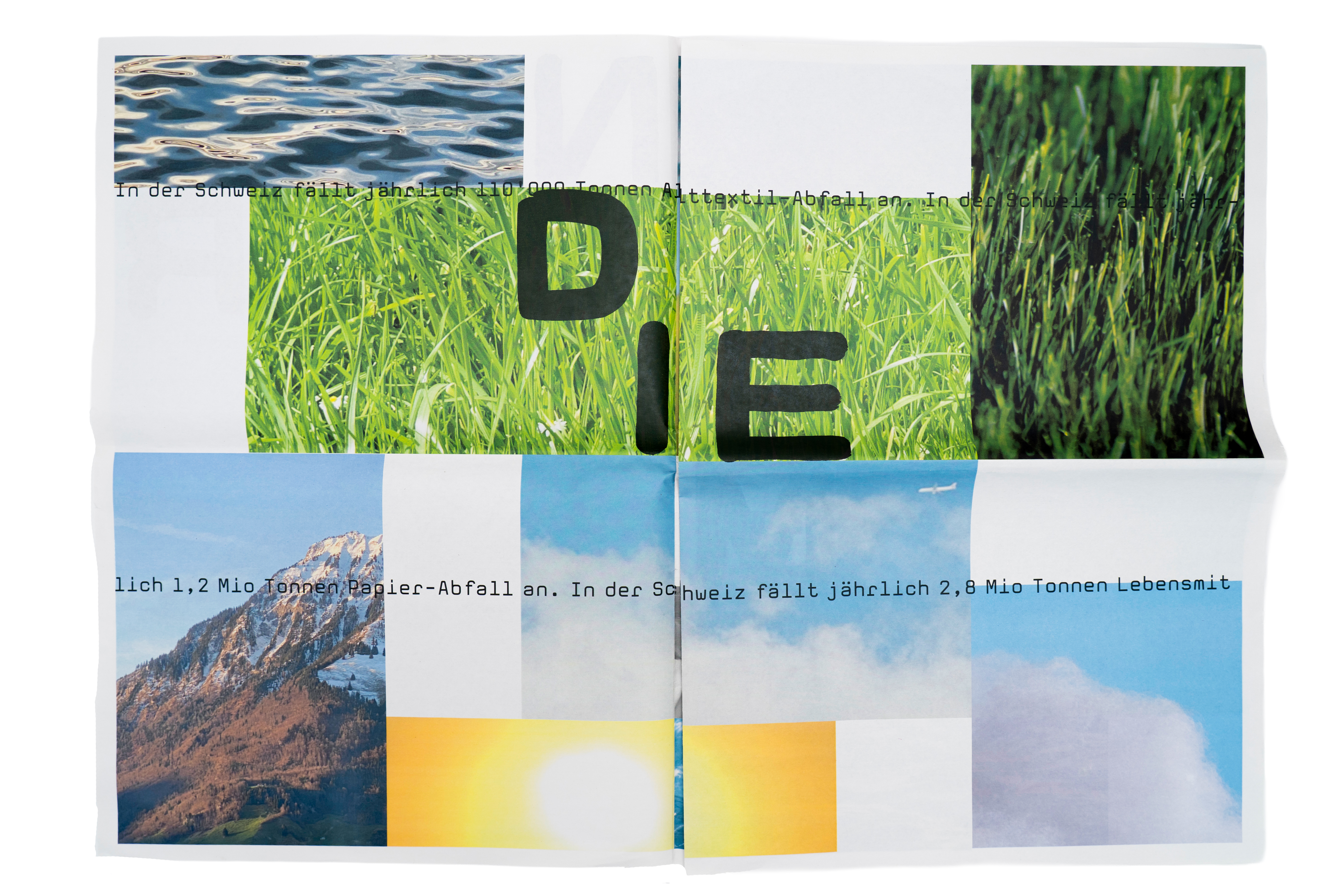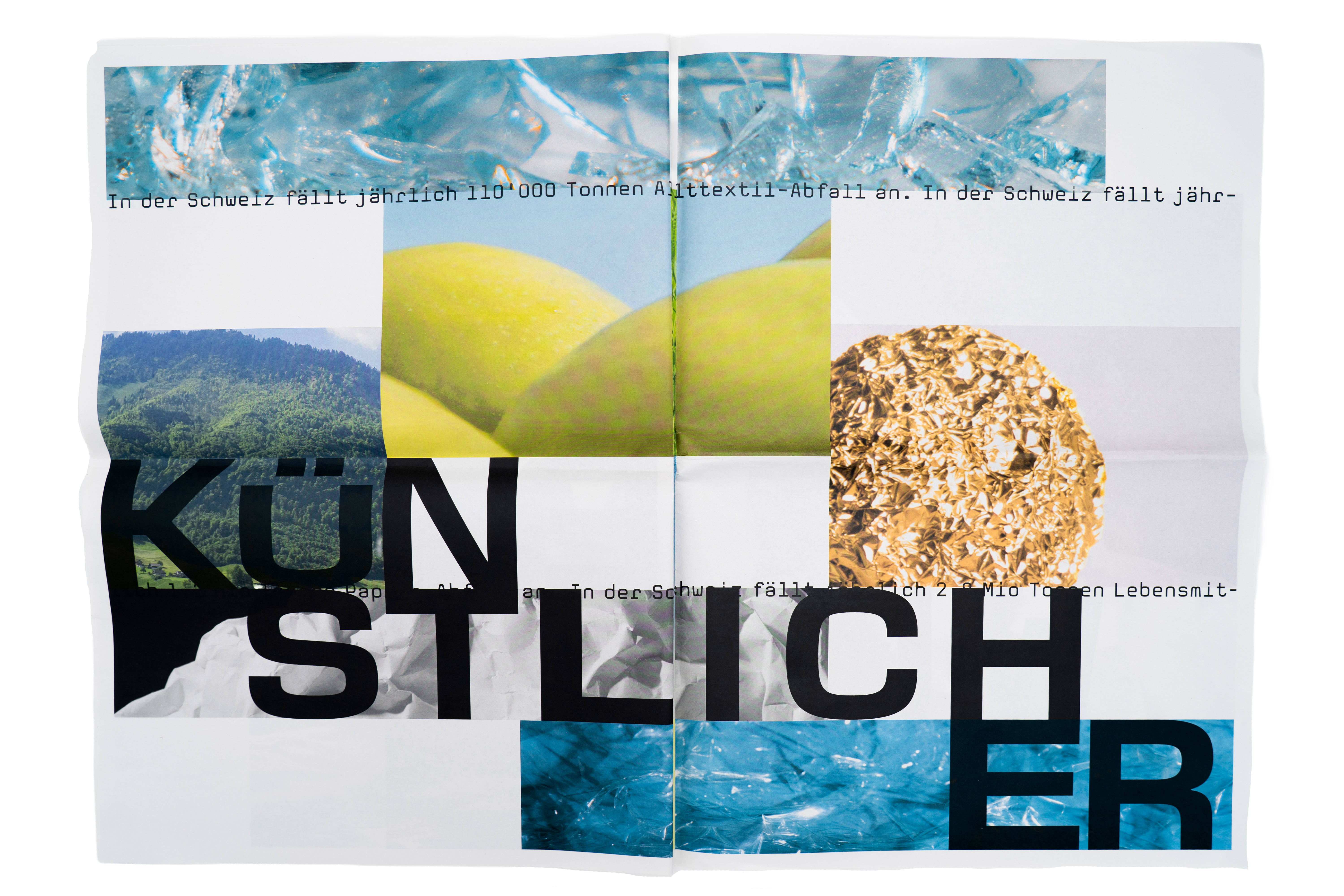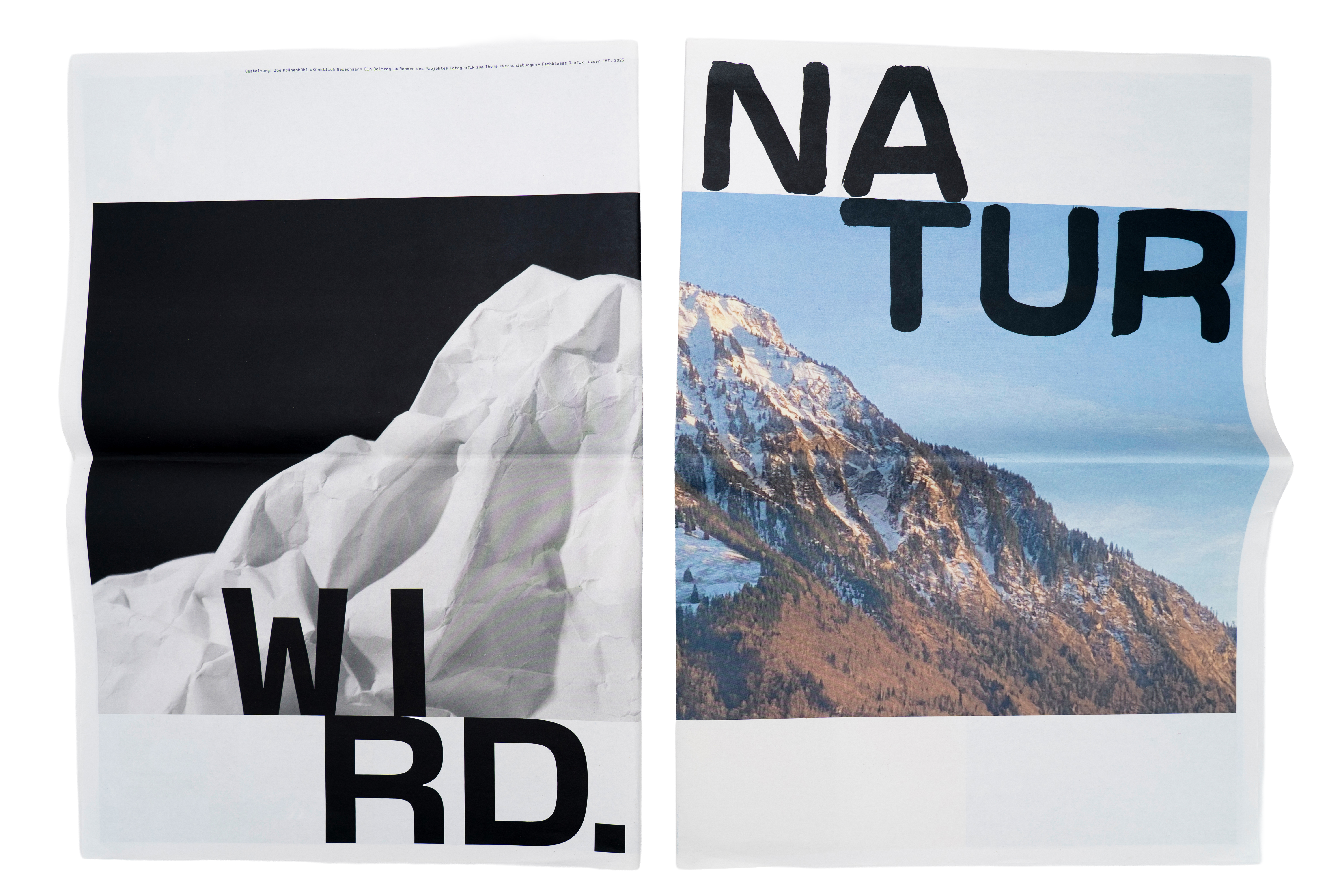 Where does the artificial begin, and where does the natural end? The newspaper builds upon the poster and tells this development as a visual sequence. At the beginning, the pages show real landscapes: water, meadow, sky, light. Step by step, the images transform, and materials take over the forms of nature. Paper becomes a mountain, plastic becomes water, metal becomes sun. A handwritten script is added, bringing back the human element, the irregular. Thus, a field of tension emerges between naturalness and construction